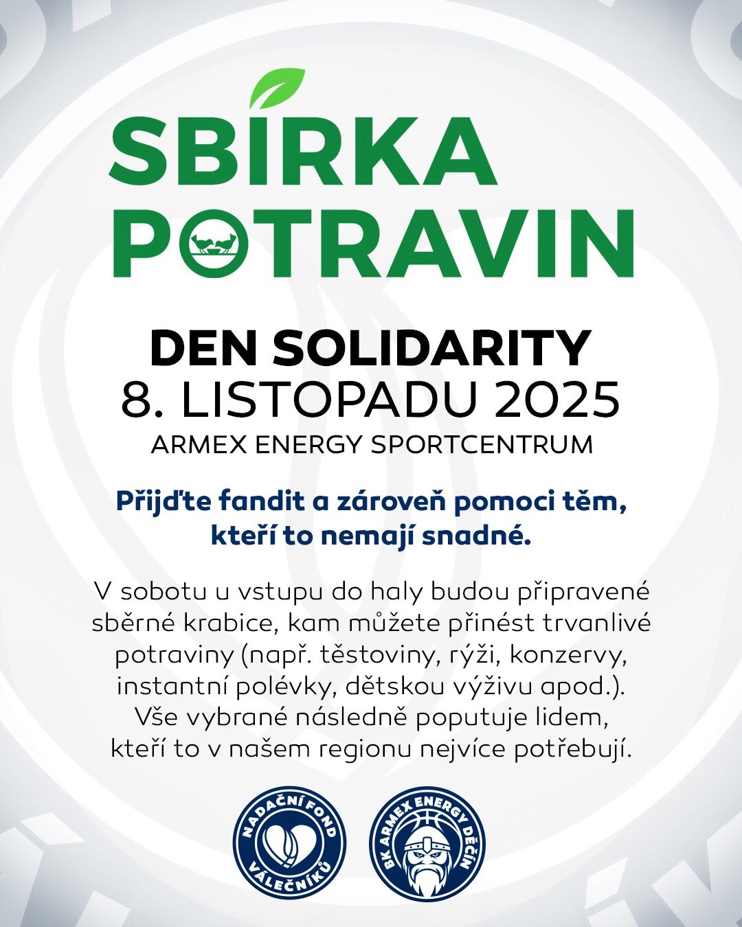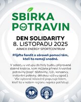Trvanlivé potraviny a drogerii můžete nosit do ARMEX ENERGY Sportcentra až do středy 12. 11. 2025. Vložte jej do sběrných krabic u recepce haly. Děkujeme.