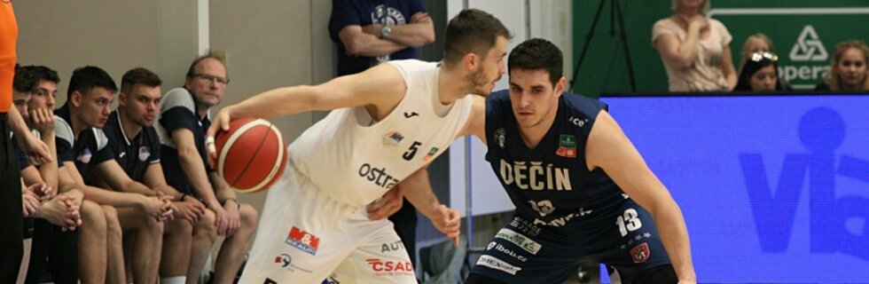 Hosté přitom nezačali zle a rozehrávač Majerčák proměnil své dvě první trojky. Na druhé straně kontroval zpod koše Šturanovič, takže po jedné minutě to bylo 4:6. Ostrava pak vedla ještě 6:9, ale pak pozvedl děčínský prapor kapitán Pomikálek a třemi trojkami v řadě otočil na 15:9. Soupeř sice ještě vyrovnal, ovšem pak dvakrát skóroval Cubbage, v poslední vteřině proměnil Pomikálek dlouhou dvojku s faulem a čtvrtina skončila 24:17. V úvodu druhé desetiminutovky skóroval jako první Heinzl, jenže za Válečníky odpověděl Slowiak, poté se dvakrát prosadil do té doby mlčící Matěj Svoboda a následně trojkou vymazal ze své střelecké listiny nulu i Walton - 33:19. Ostrava sáhla po oddechovém čase, který jí však příliš nepomohl, a po dalších bodech Pomikálka a Waltona to bylo 42:25. V závěru poločasu hosté přece jen trochu korigovali, když po koši Janů platil stav 47:35.